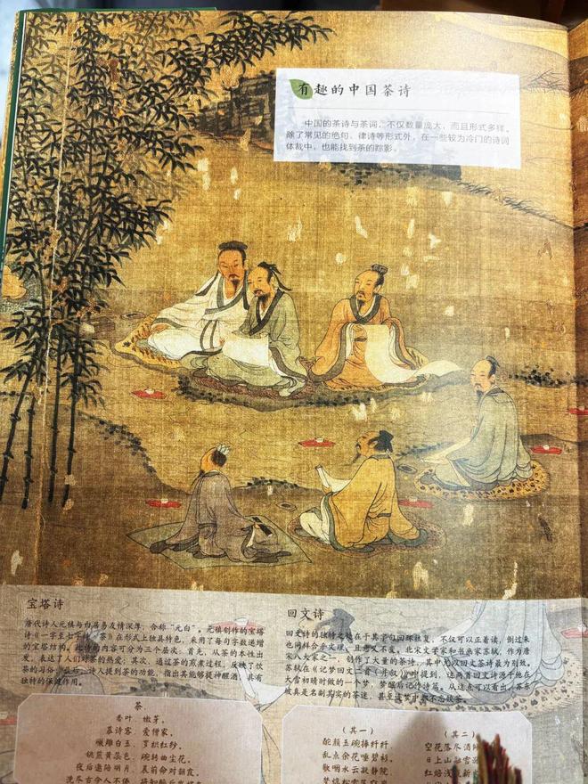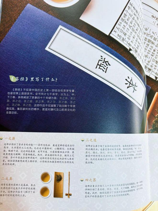 艺术级版面设计:打破传统百科的“图配文”套路,每一页都像茶席上的精心布置——茶园风光作衬底、古画拼贴成边框,连章节标题都用书法字体题写,翻阅时宛如品一杯好茶,眼到之处皆风景。